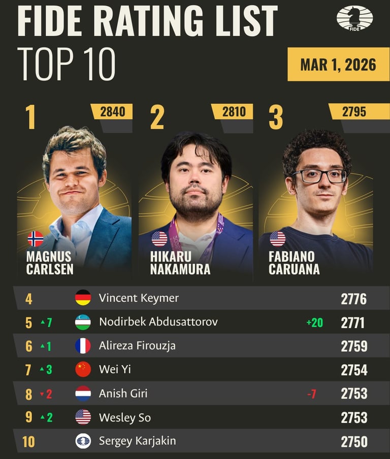 On the 1st of March, 2026, the official chess governing body FIDE posted that there are no Indian chess players in World top ten as per the updating rating list. Though later, they fixed the mistake of including former World championship contender GM Sergey Karjakin by saying,